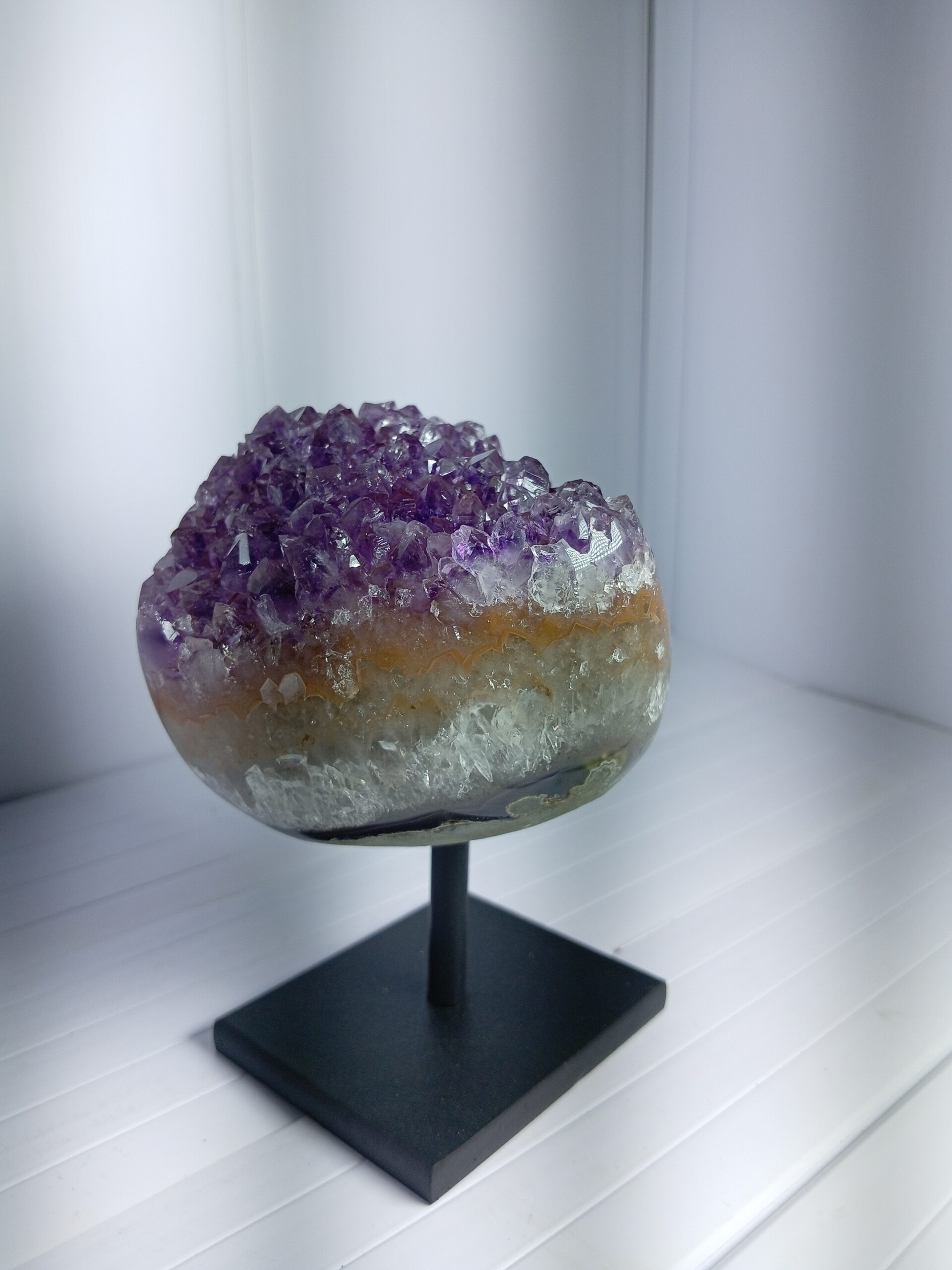 Geoda Semipulida de Amatista Púrpura Intensa y Ágata. Pieza deslumbrante que exhibe una parte superior de cristales morados profundos sobre una matriz de ágata gris y tonos terrosos. Combinación perfecta de brillo y forma natural. Un punto focal de tranquilidad y elegancia.
