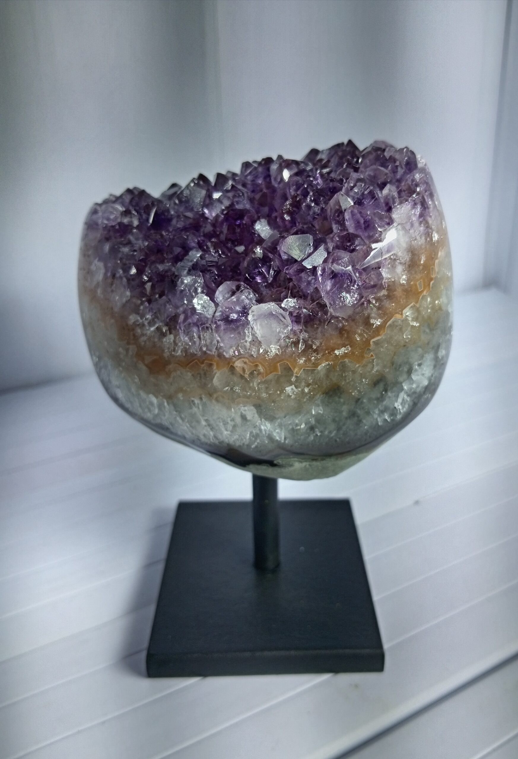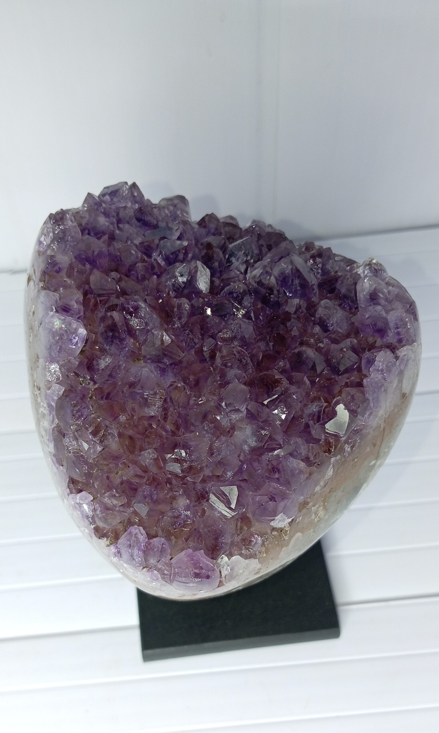 El interior de la geoda está adornado con un denso agrupamiento de cristales de amatista en tonos púrpura intenso, con excelente brillo y claridad.